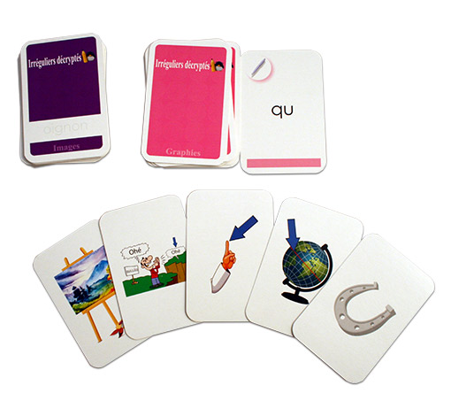 Ce jeu se joue de la même façon que le premier : ce sont cette fois des cartes graphies qui sont les cartes consignes et des cartes images représentant les mots irréguliers qui sont les cartes jouées. Au dos de chaque carte violette, le mot correspondant à l’image est écrit avec une encre qui se révèle sous lumière UV.