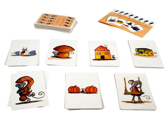 « Où est la souris ? » est composé de 2 jeux identiques de 30 cartes et 4 jokers. Dans chaque jeu on trouve 5 positions de la souris par rapport à un objet.